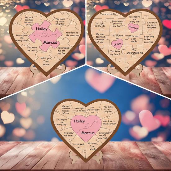 Świętuj jedność rodziny tym puzzlem w kształcie serca, pięknie wykonaną drewnianą tabliczką symbolizującą miłość i wspólnotę.. Każdy element w kształcie serca można spersonalizować imionami Twoich bliskich, co czyni go znaczącym pamiątkowym prezentem na Boże Narodzenie, wesela, rocznice lub Dzień Matki..
