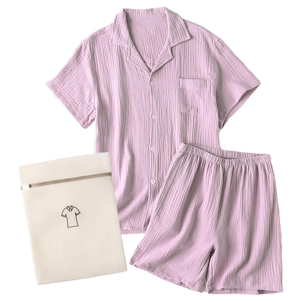 Enjoy a good night's sleep with Plumir's high-quality loungewear. Made with 100% cotton gauze, it's soft to the touch, highly breathable, and comfortable even in the summer. This set features a short-sleeved top and shorts, allowing for unrestricted movement. The top features convenient removable cups, and the shorts have pockets for added functionality. A laundry net is included for easy care. Available in pink and light blue, this pajama set is lightweight and perfect for travel. The design is feminine yet functional. This pajama set combines high-quality materials with practical features to complement your everyday life.