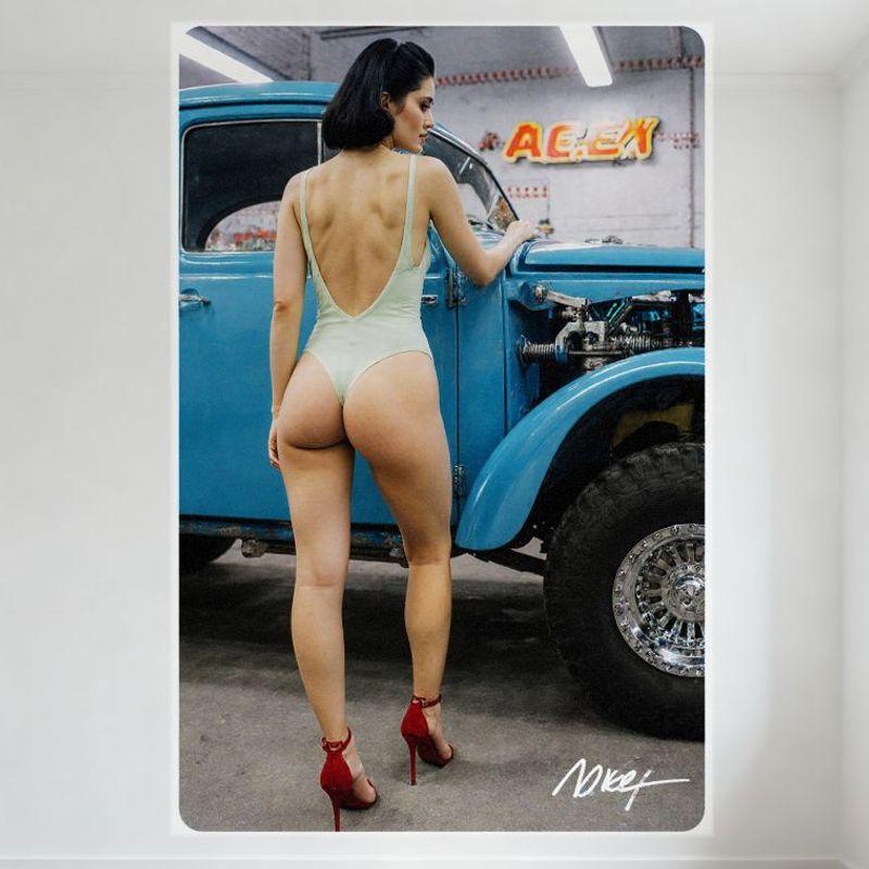 Seksowny body bez pleców dla kobiety z vintage niebieską ciężarówką, otwartą maską, blaszany znak, metalowy plakat - Dekoracja ściany domu, baru, kawiarni, Moda Samochód - R