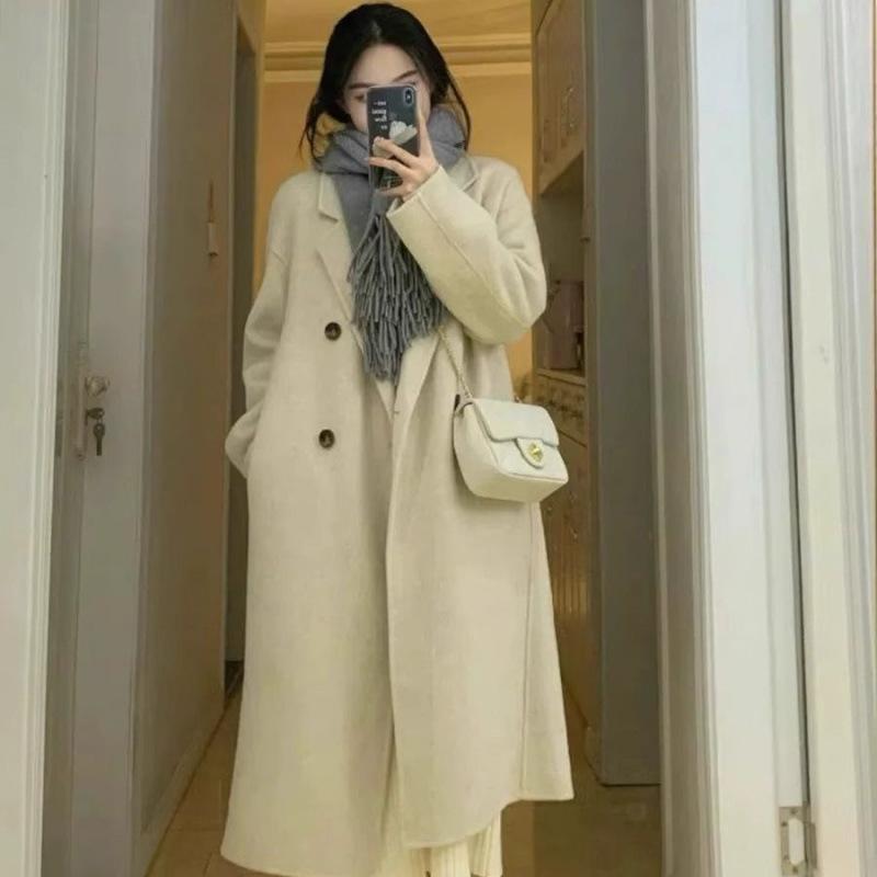 Oatmeal Color Double-sided Velvet Coat for Women Autumn and Winter New Korean Style Mid-length Knee-length Woolen Coat