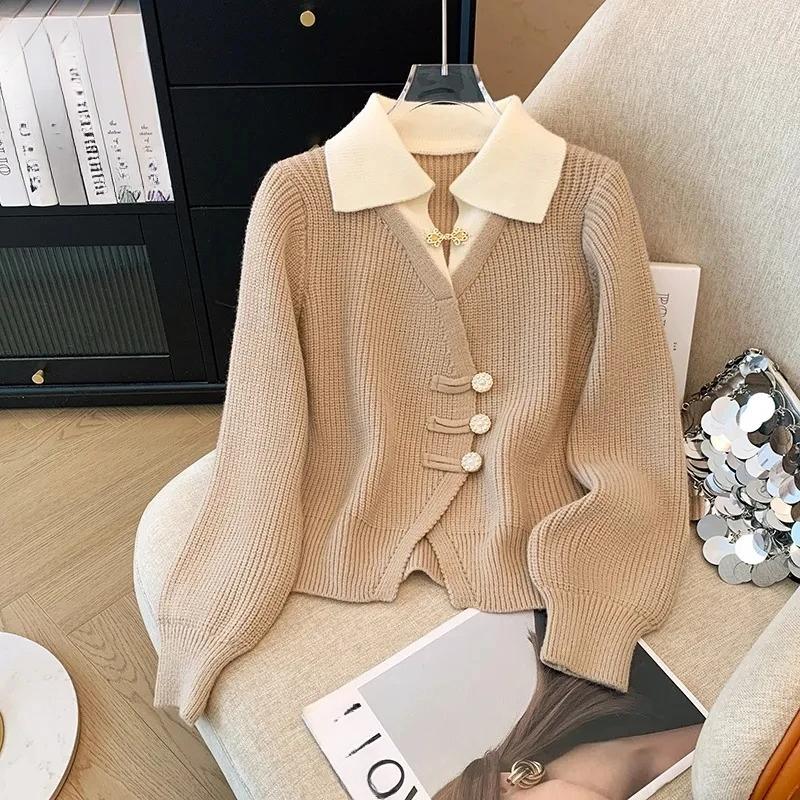 Autumn Spring Design Splicing Slim Women Knitted Cardigan Sweater Jacket Fashion Fake Two Items Loose Ladies Top