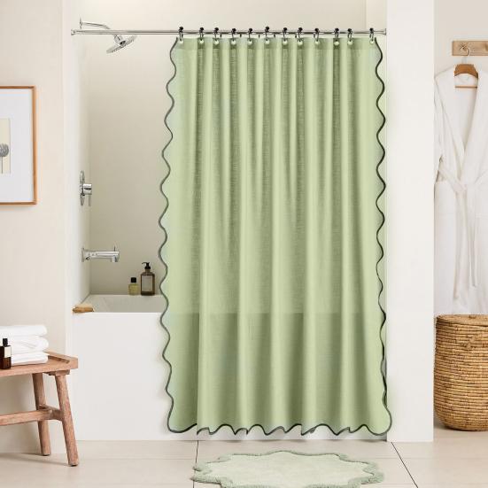 Elegancki Falowany Wzór z Czarnym Wykończeniem: Podnieś wystrój swojej łazienki dzięki wykwintnym falowanym krawędziom podkreślonym drobnym czarnym wykończeniem.. Dostępna w wielu kolorach, ta zasłona dodaje wyrafinowanego uroku i wyszukanego stylu dzięki starannemu szyciu i rzemiosłu.. Jego unikalna estetyka dopełnia zarówno nowoczesne, jak i klasyczne wnętrza łazienek.
