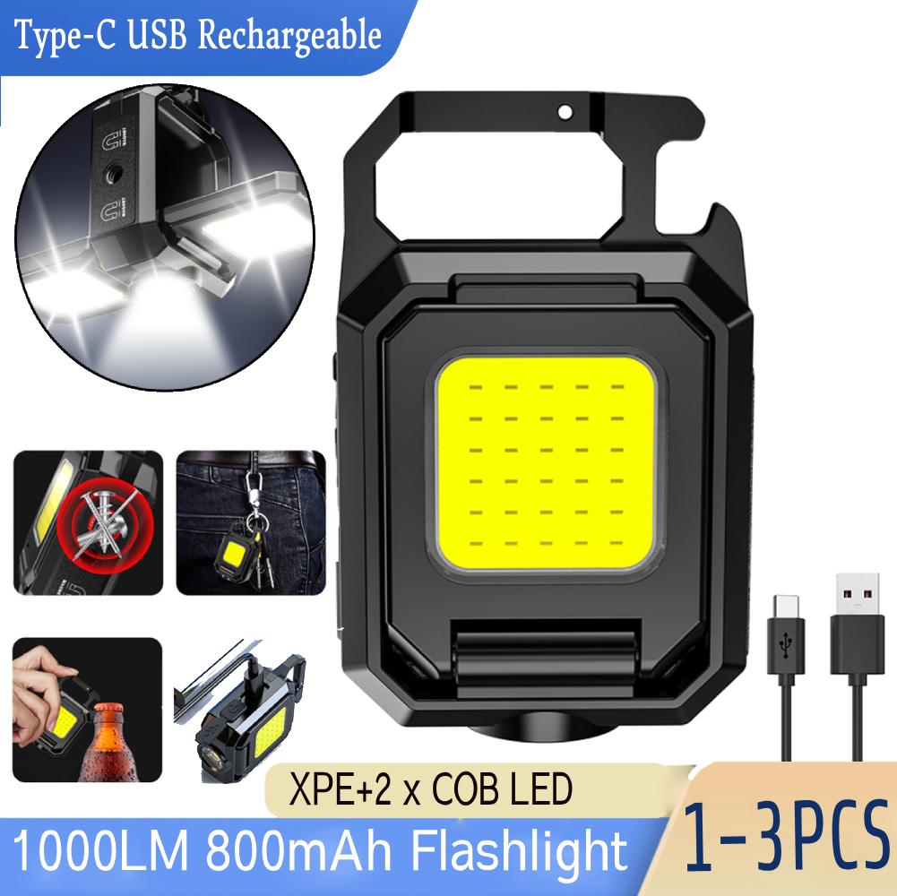 1-3PCS XPE Keychain Light 1000LM COB LED Pocket Work Light 800mAh Type-C USB Rechargeable IPX4 Waterproof for Outdoor Camping