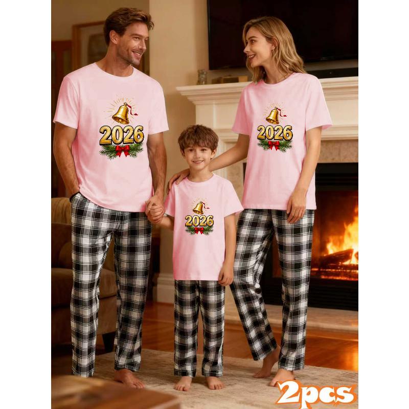 2026 New Year Family Holiday Outfit, Stylish Short Sleeve Tees & Classic Plaid Pants& Family Gatherings