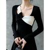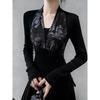 Retro Splicing V-neck Bottoming Shirt T-shirt for Women to Wear Autumn Winter Waist Slim Long-sleeved Top