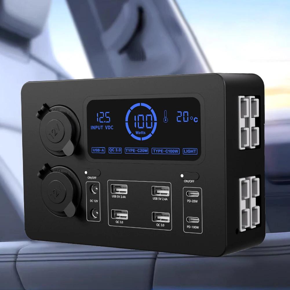 12V 100W Mini Power Box with LED Lights LCD Display Power Box USB-C & QC3.0 Ports Portable Control Hub for RVs SUVs Boats