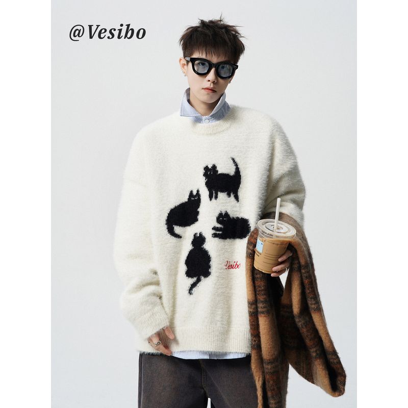 Heavy Mohair Knit Sweater for Men, Winter Trendy Brand, Lazy Style Cartoon Sweater, American Loose Fit Couple Casual Jacket