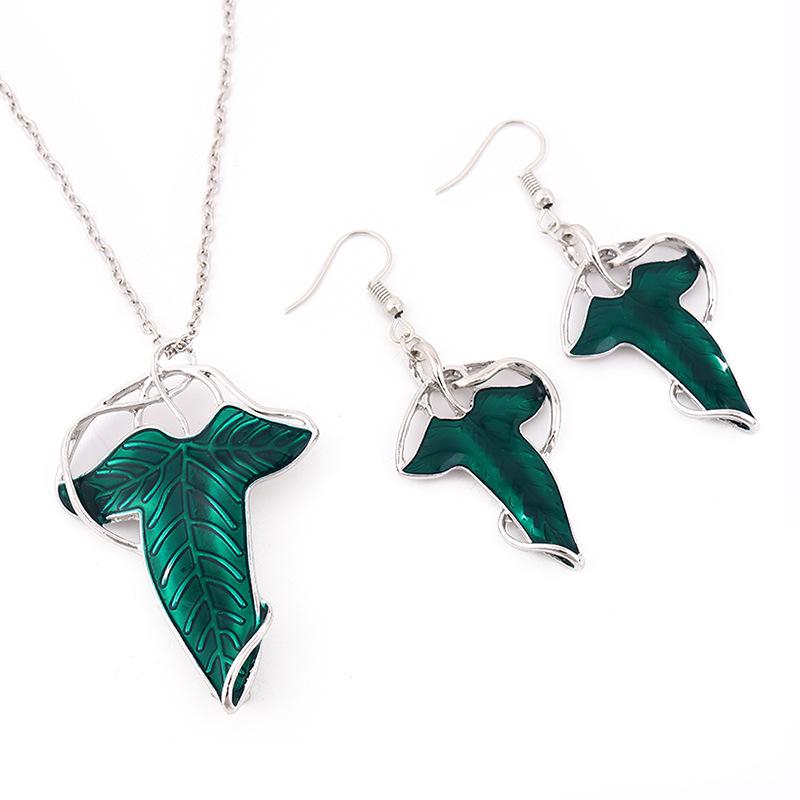 Europejsko-Amerykański Filmowy Zestaw Broszka-Naszyjnik i Kolczyki z Liściem - W Stylu Elfickim Władcy Pierścieni