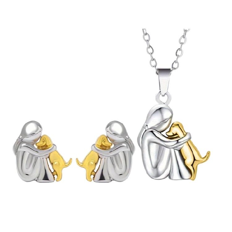Poczuj ciepło przyjaźni dzięki naszym kolczykom/naszyjnikowi z zawieszką przedstawiającą dziewczynkę i psa, uroczemu elementowi symbolizującemu czyste i niewinne więzi, idealnemu do noszenia na co dzień.