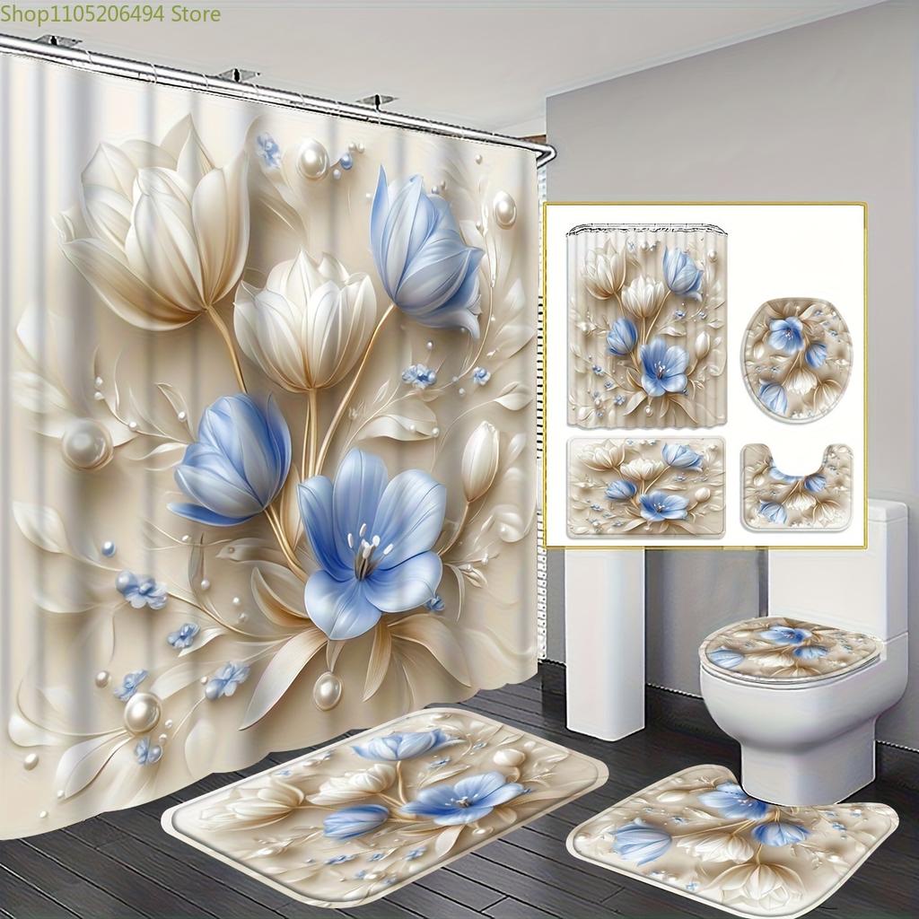 1/3/4pcs Blue Tulip Shower Curtain Bath Set with Bath Mat, U-Shaped Mat & Toilet Lid Cover - Elegant Botanical Bathroom Decor,