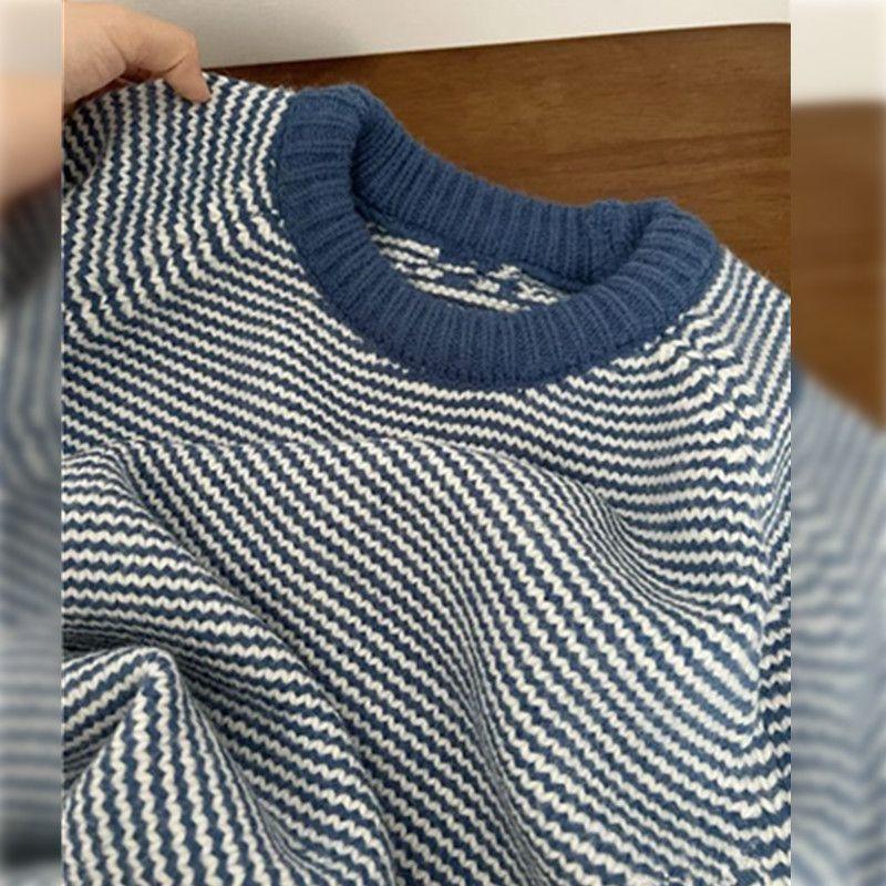 Korean retro contrasting striped blue sweater women's loose lazy high-end casual thickened knitted top