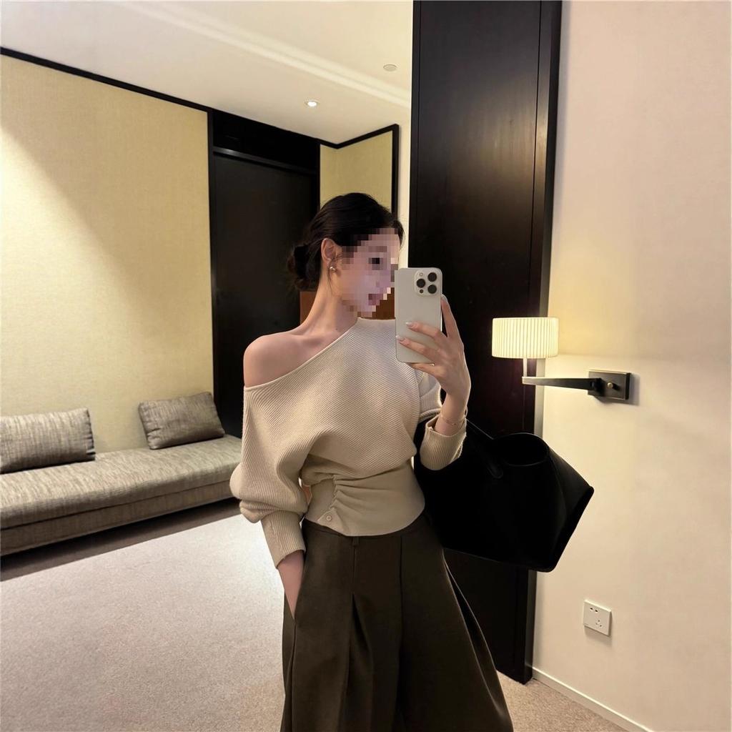 Sexy diagonal neck off-the-shoulder long-sleeved knitted sweater women's autumn pleated waist pullover temperament slim-fit short top