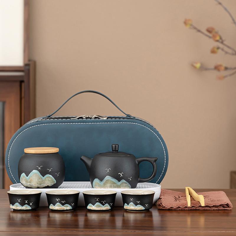 Zestaw do herbaty podróżny Zestaw do herbaty kempingowy Outdoor Przenośny zestaw do herbaty Czarna ceramika Kubek Kuaike Jeden czajniczek Cztery filiżanki Torba do przechowywania Prezenty biznesowe