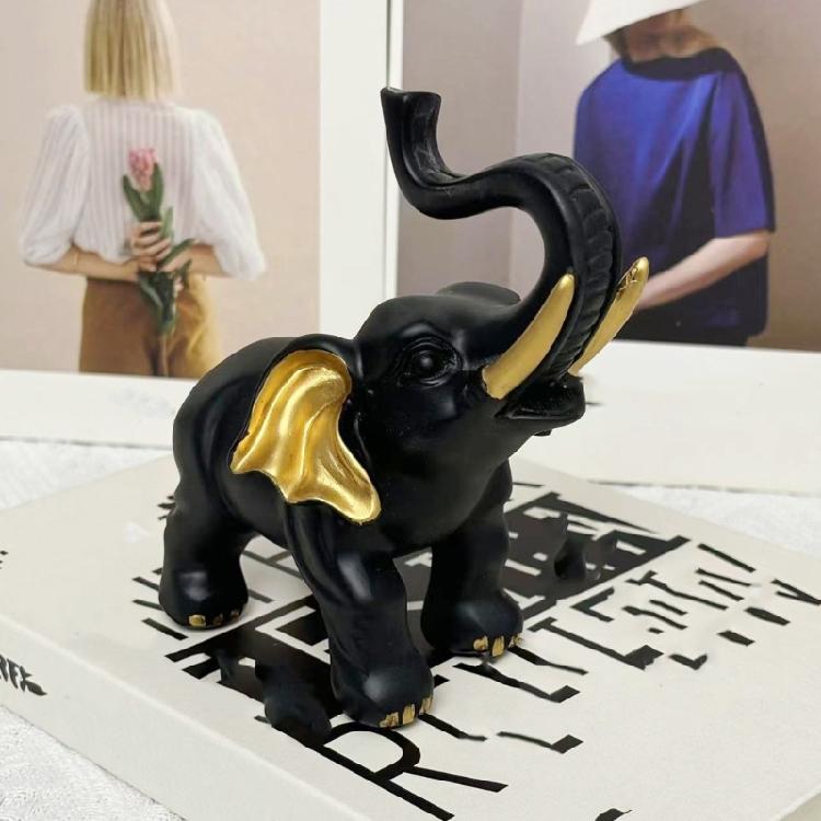 Wykwintnie wykonana żywiczna statuetka słonia łączy zaawansowane czarne i złote wykończenie z symbolicznym wzorem przynoszącym szczęście, idealna jako rzeźba dekoracyjna dla miłośników tradycyjnego wystroju domu.