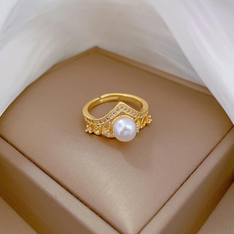 Real Gold Crown Pearl String Empty Ring Opening Adjustable Simple Jewelry Japanese Ring Couple Ring