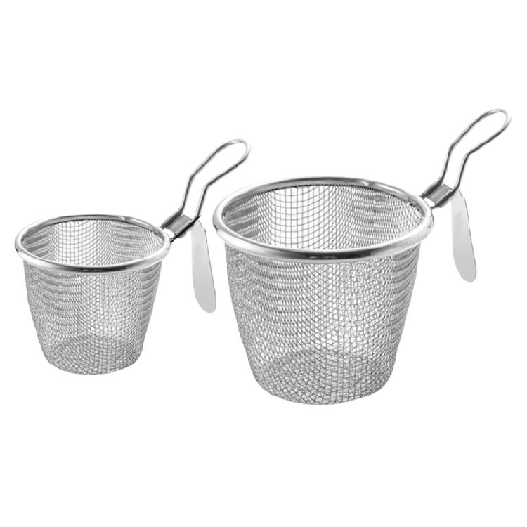 Ten durszlak z drobnej siatki drucianej ma głęboką konstrukcję koszyka i wygodny uchwyt z haczykiem, zapewniając bezpieczne i bezwysiłkowe przygotowywanie potraw, jednocześnie chroniąc dłoń przed ciepłem.
