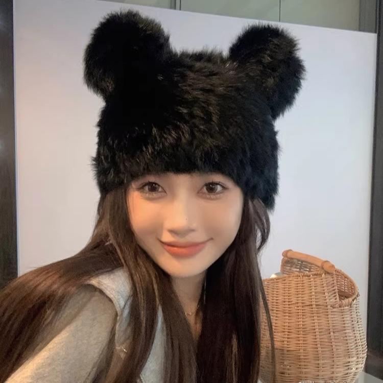 Mickey Ears Rabbit Hair Hat Women's Autumn and Winter Thickened Cold-proof Warm Baotou Hat Plush Fur Cute Headscarf Hat
