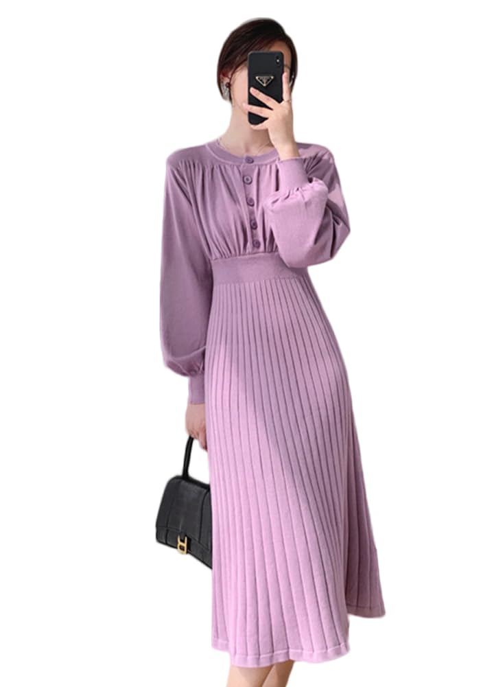 Vilaria Knit Long Round Solid Casual Women's Dress, Sleeve, Neck, Flattering, Autumn/Winter, Color, Stylish,
