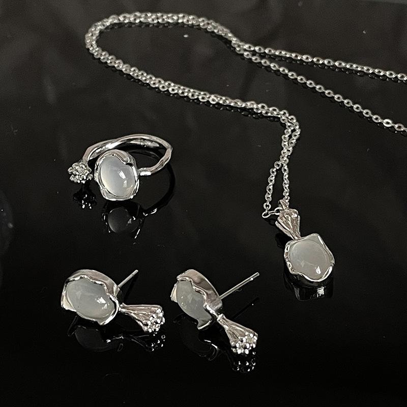 Zestaw Niszowy, Kolczyki Sztyfty z Kamieniem Księżycowym, Pąki Kwiatów, Luksusowy Otwarty Pierścionek, Naszyjnik w Zimnym Stylu, Spersonalizowana Kobieta