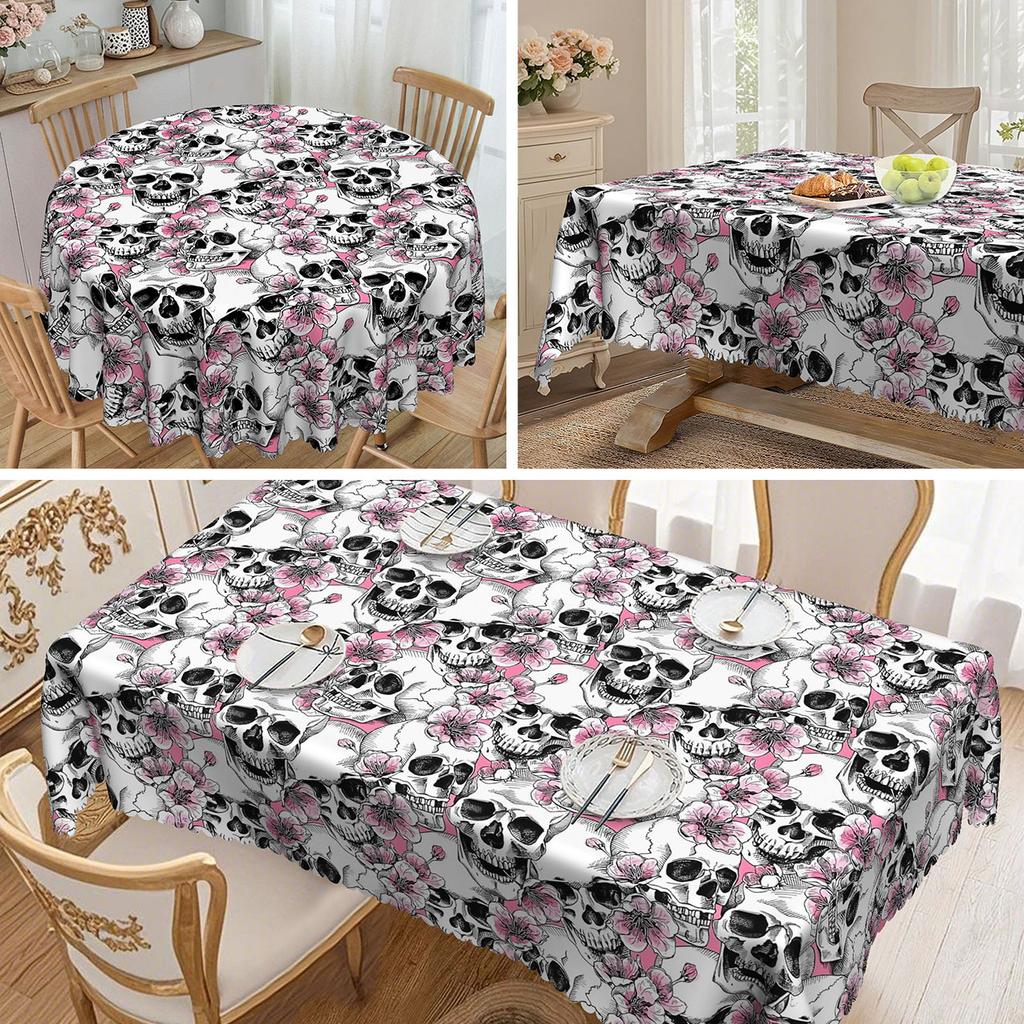 1 Gothic Skull Tablecloth - Pink Flowers With Skull, Complex Skull Pattern, Polyester Fabric.