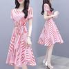 Women Pink Tight Waist Lacing Stripe Printing Short Sleeve Dress