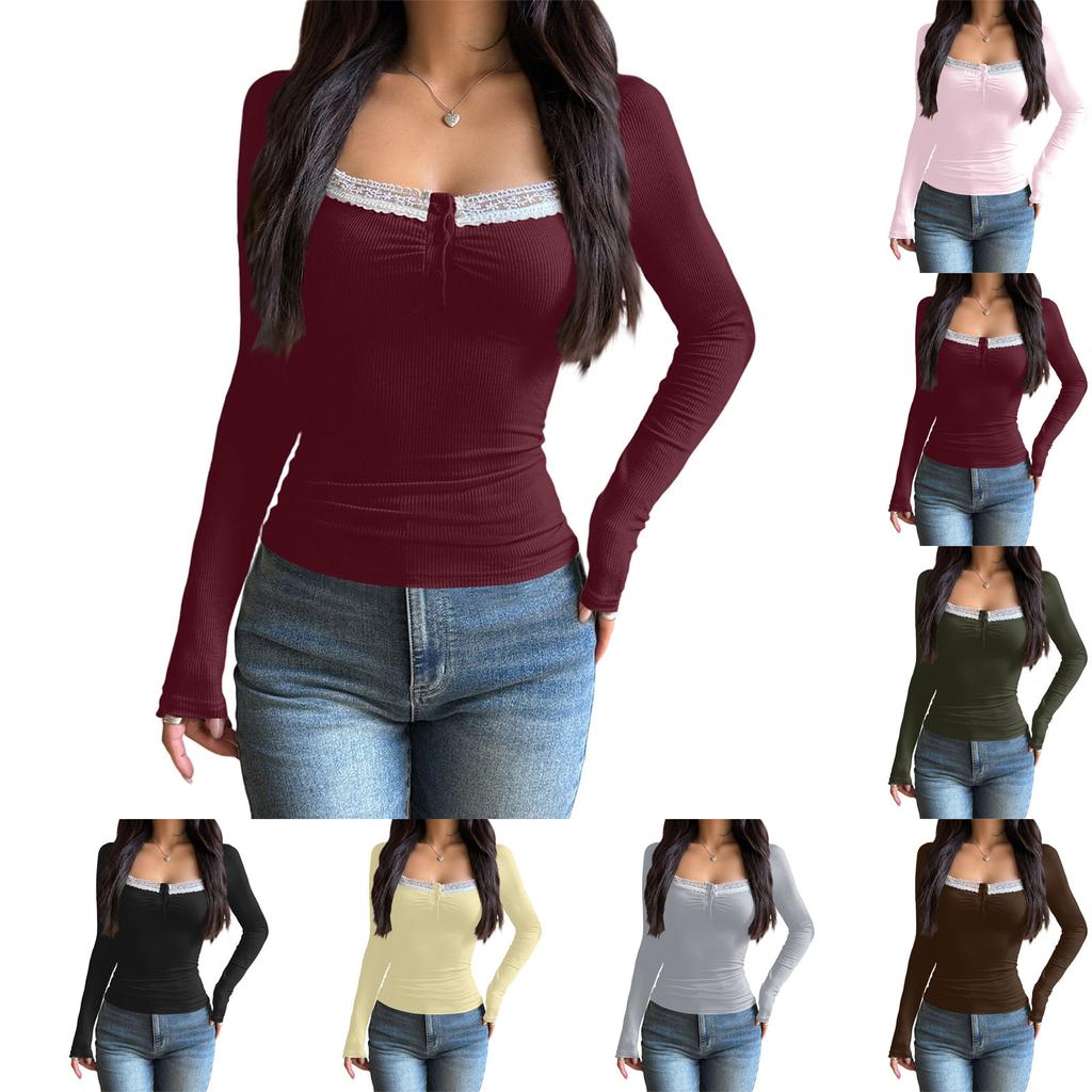 Damska codzienna seksowna bluzka/podkoszulka/t-shirt z długim rękawem, jednolity kolor, z koronką przy dekolcie