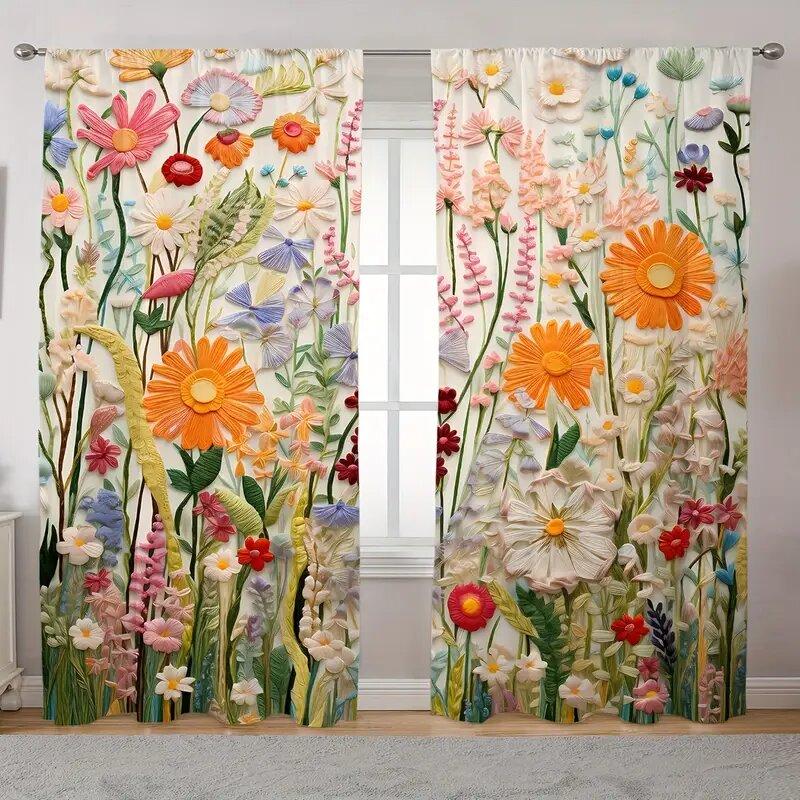 2 sztuki - Klasyczne zasłony ze sztuką i nadrukiem roślinnym, zasłony z tunelem na karnisz, dekoracja domu, dekoracja pokoju