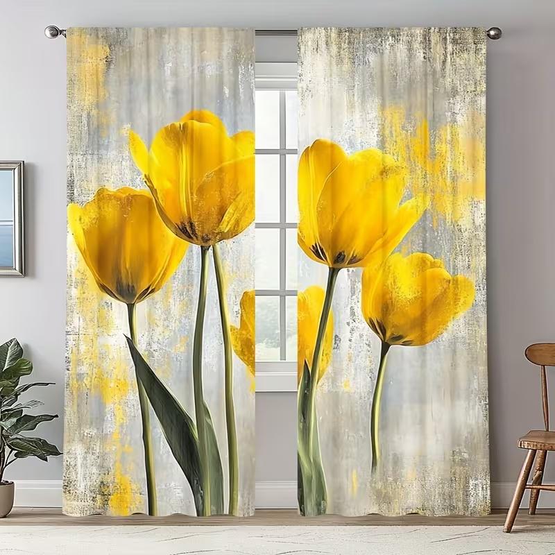 2 szt. Żółte zasłony z nadrukiem tulipanów, odpowiednie do dekoracji sypialni, salonu, kuchni, dekoracji domu, dekoracji okien