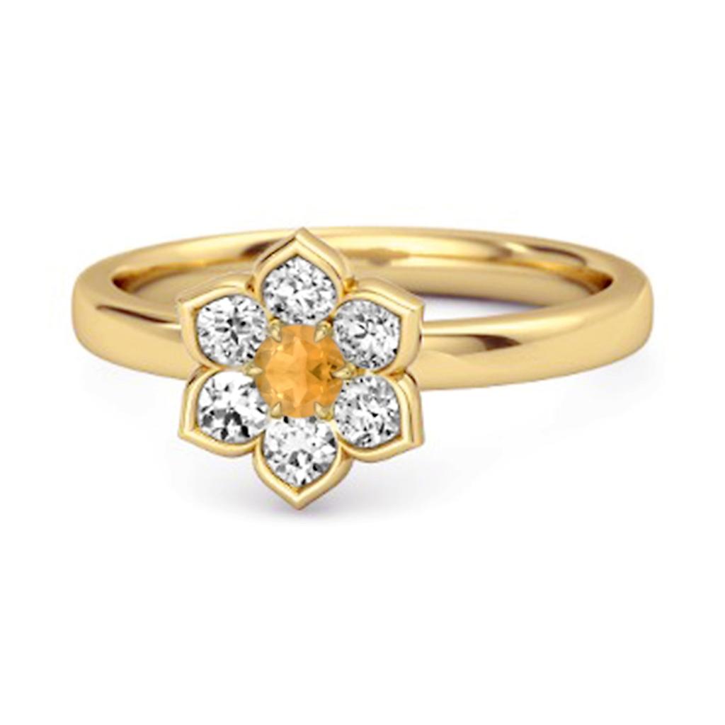 Pierścionek z kwiatową aureolą ze srebra próby 925 z okrągłym cytrynem o średnicy 3 mm (0,10 ct) podkreślone płatkami białego topazu. Delikatny design inspirowany naturą.