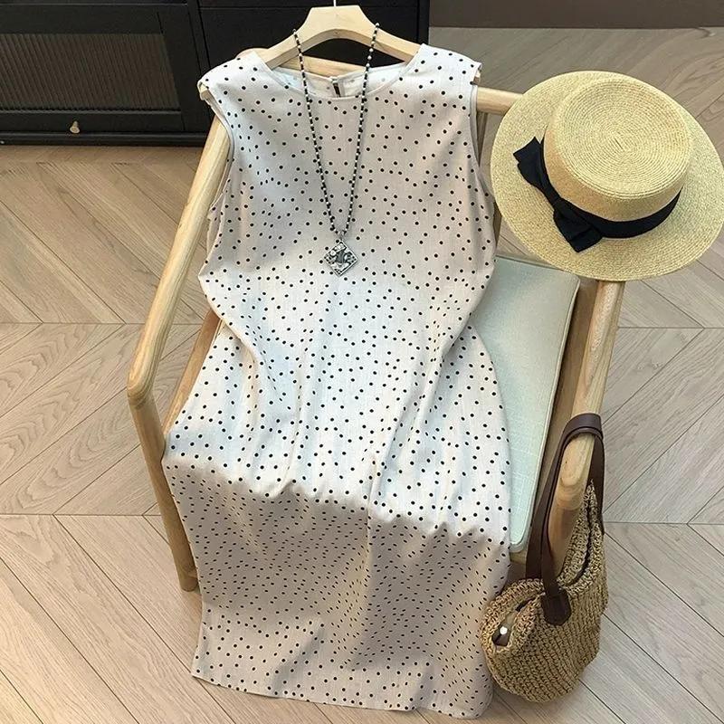 Damska Bawełniano-Lniana Sukienka w Kropki z Okrągłym Dekoltem Bez Rękawów Elegancka Długa Spódnica do Pracy Codzienna