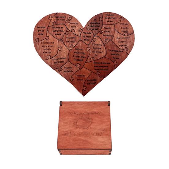 Te puzzle miłosne mają kształt serca, są wykonane z wysokiej jakości drewna o gładkiej powierzchni i pięknym usłojeniu.. Zawiera 20 płynących z serca powodów, dla których kogoś kochasz, co czyni go wyjątkowym i romantycznym prezentem dla Twojego partnera, współmałżonka lub bliskiej rodziny i przyjaciół..