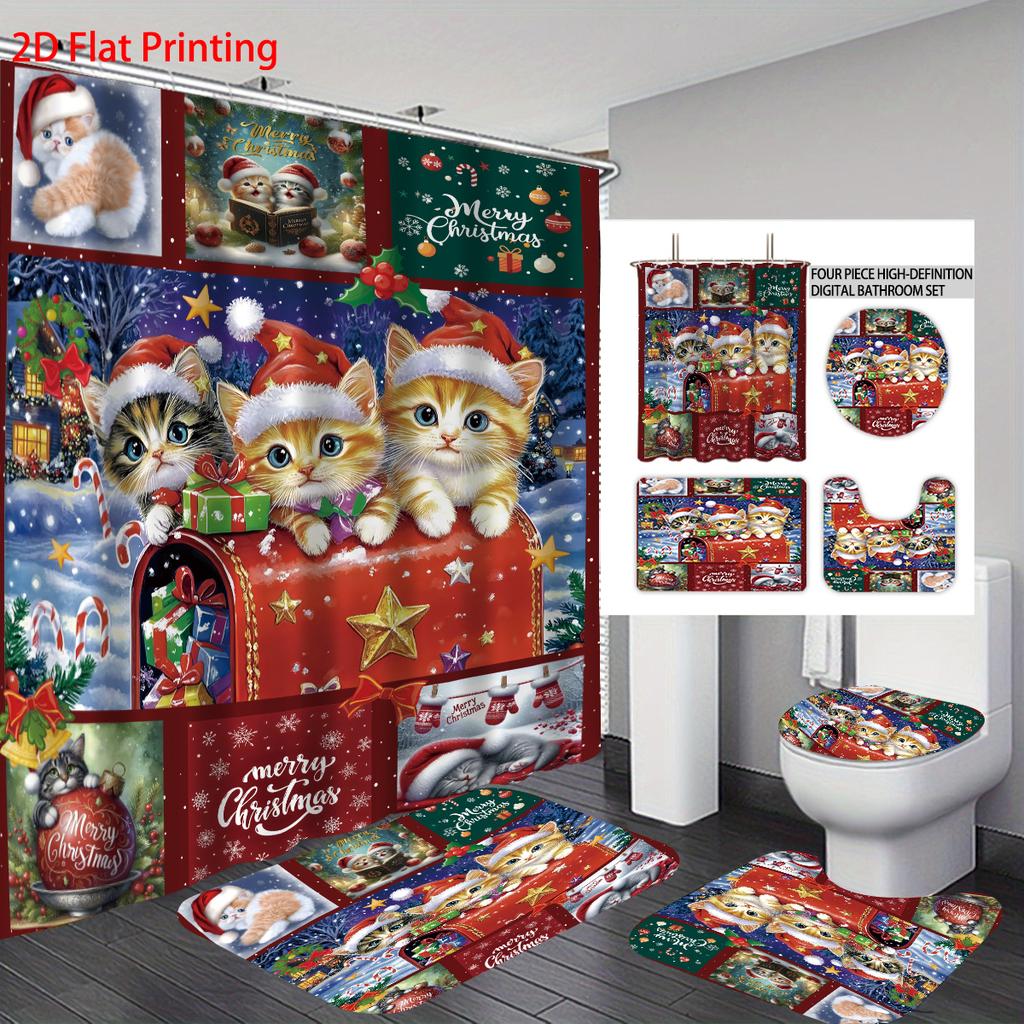 4pcs Christmas Cat Printed Bathroom Set 180x180 Waterproof Shower Curtain, Floor Mat, U-shaped Mat, and Toilet Mat