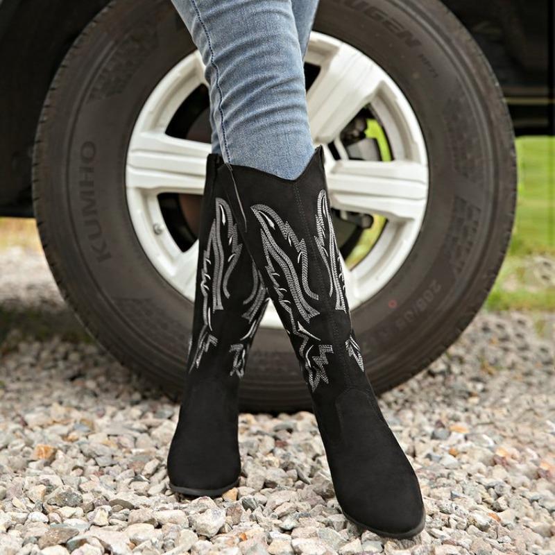 Women's Plus Size Embroidered Over-the-Knee Denim Boots, Chunky Heel Retro Ethnic Stretch Riding Boots