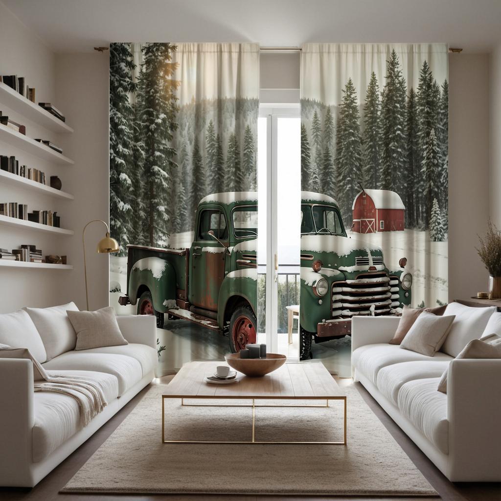 2pcs HD Pine forest truck snow view decorative curtain Green tie digital printed curtain Home Decoration style Decoration liv