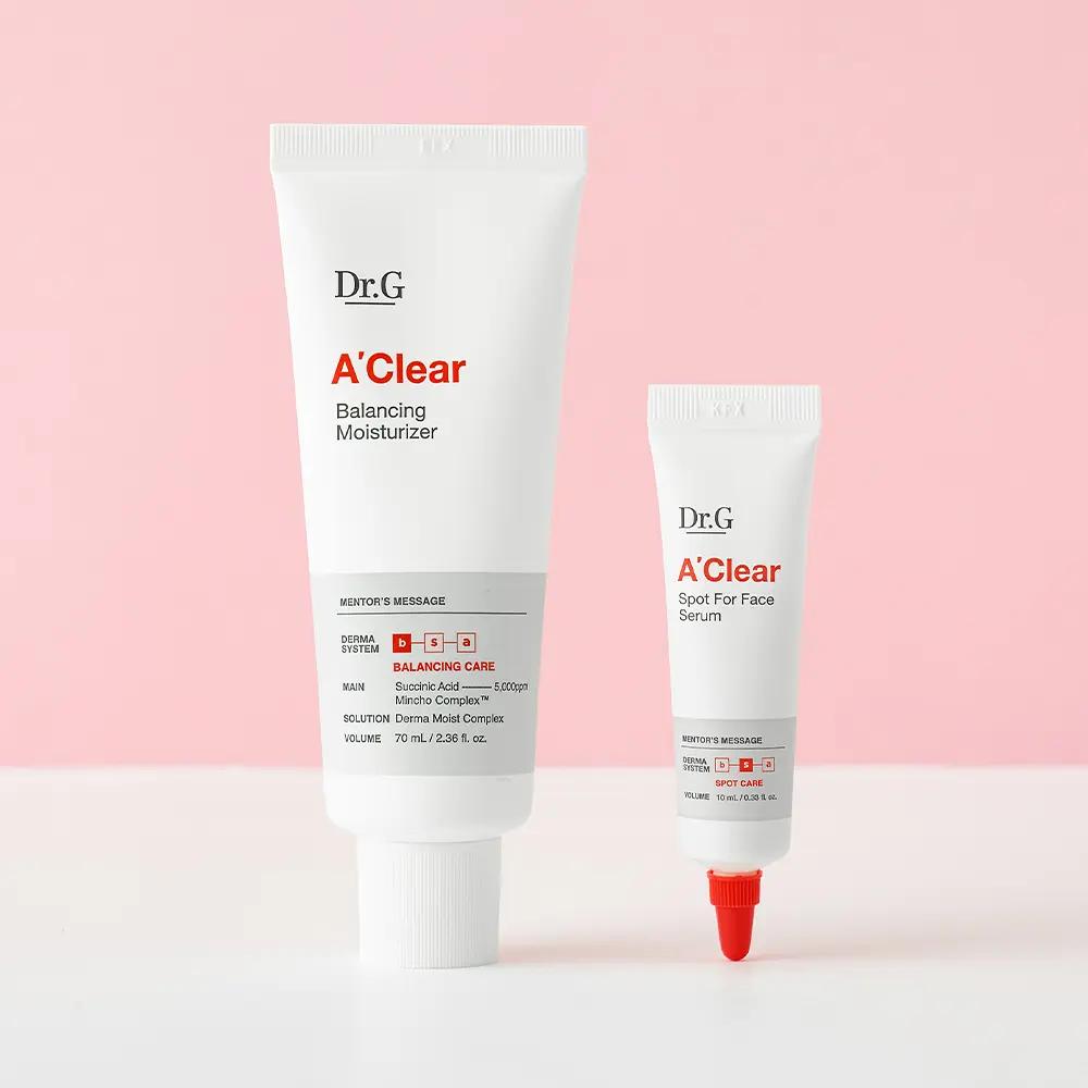 The Dr.G A-Clear Balancing Moisturizer is a lightweight, non-comedogenic moisturizer specially formulated for acne-prone and troubled skin. This balancing formula helps control excess sebum, soothe irritation, and maintain optimal moisture levels without clogging pores. This special set includes a 10ml balancing serum, offering enhanced calming and oil-control care for clearer, healthier-looking skin.