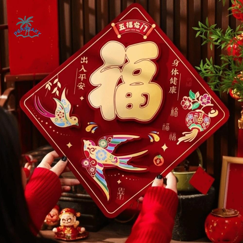 Chinese Style Spring Festival Door Sticker Cartoon Traditional New Year Sticker 3D Flocking Blessing Words