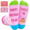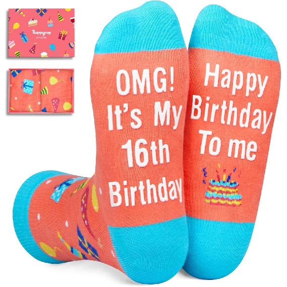 16TH BIRTHDAY GIFTS: These birthday socks are perfect for teen girls. The socks feature birthday gifts, hats, cakes, and other elements, while the bottom features a message: "OMG It's My 16th Birthday Happy Birthday To Me."