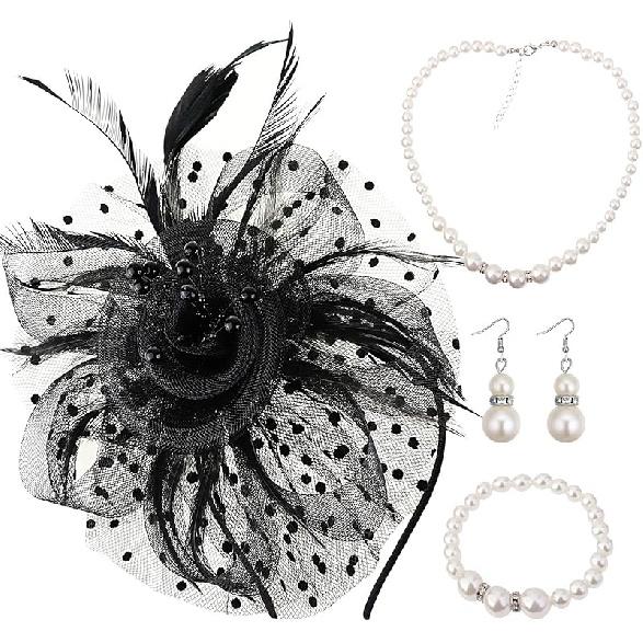 DRESHOW Fascinators Hat Flower Mesh Ribbons Feathers on a Headband and a Clip Tea Party Headwear for Girls and Women