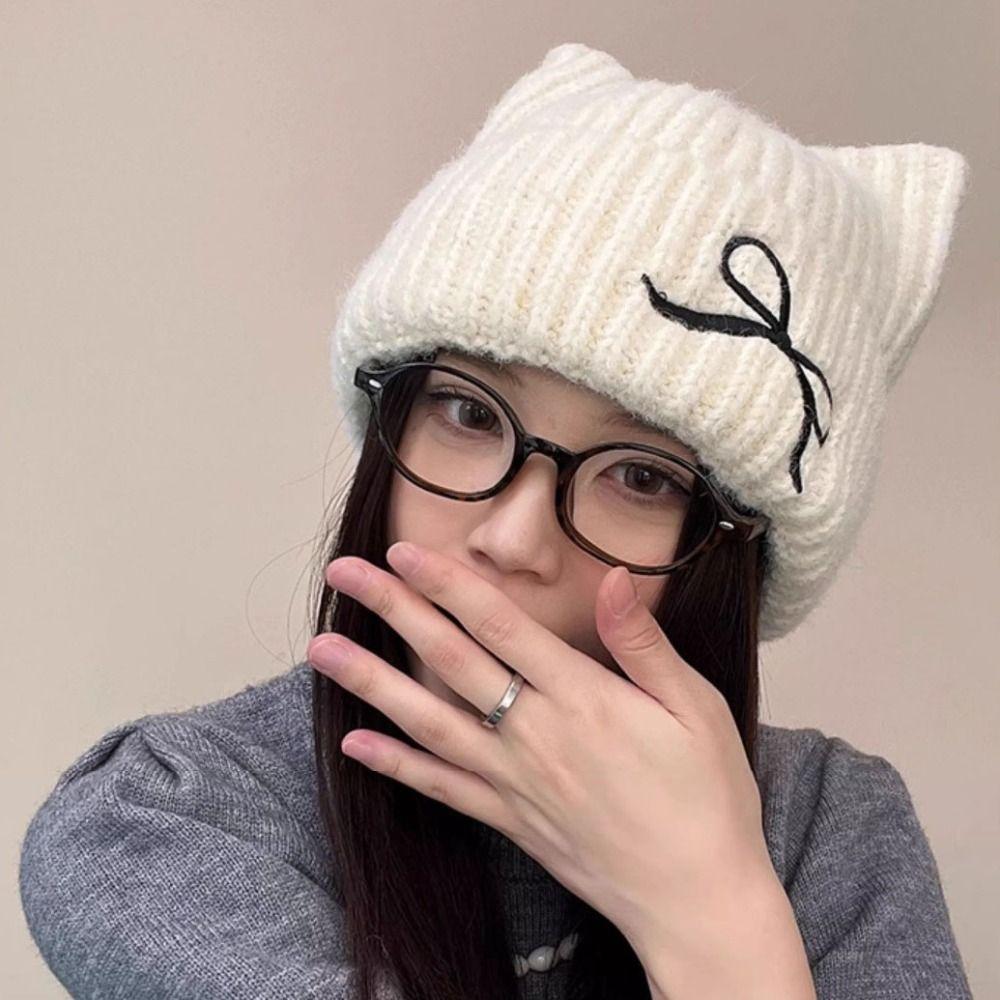 Solid Color Knitted Woolen Hat Windproof Knitted Skullies Fashion Cat Ear Beanie Winter