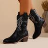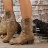 Damskie brązowe buty westernowe o szerokiej szerokości, botki do połowy łydki z okrągłym noskiem, damskie botki na kostkę na vintageowym masywnym obcasie