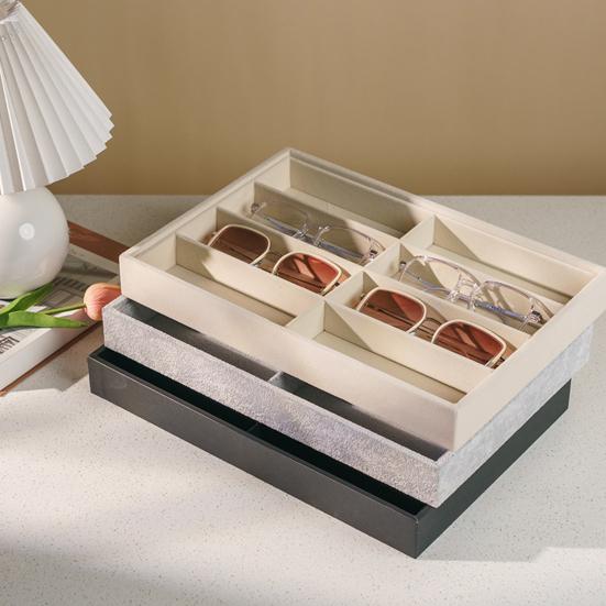 Jego konstrukcja o dużej pojemności obejmuje 8 niezależnych przegródek, idealnych do organizacji wielu par okularów, okularów przeciwsłonecznych, bransoletek, pierścionków, naszyjników i innych drobnych akcesoriów.. Miękka aksamitna wyściółka chroni soczewki i biżuterię przed zarysowaniami, zapewniając bezpieczne przechowywanie delikatnych przedmiotów..
