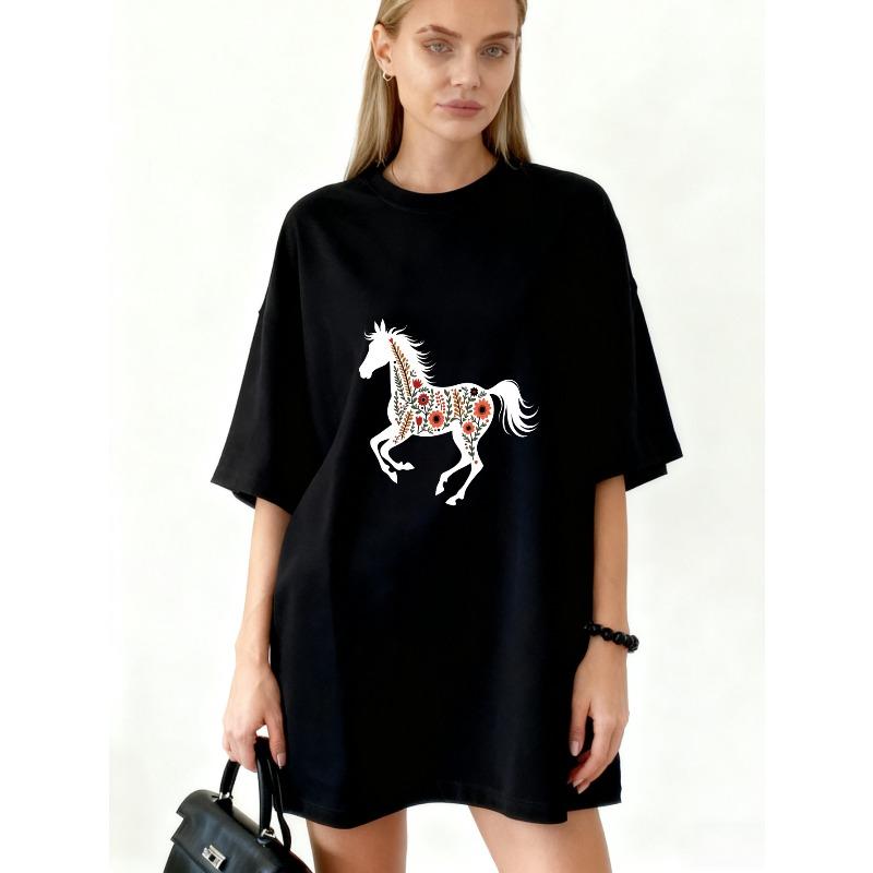 Sukienka T-shirtowa oversize z nadrukiem wzoru czarnego konia, odzież codzienna dla kobiet