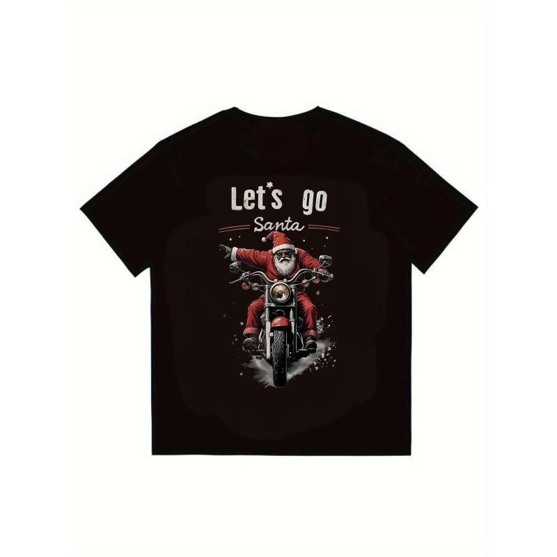 Christmas T Shirt Black Santa Riding Motorcycle Let's Go Santa Print Holiday Party Casual Wear