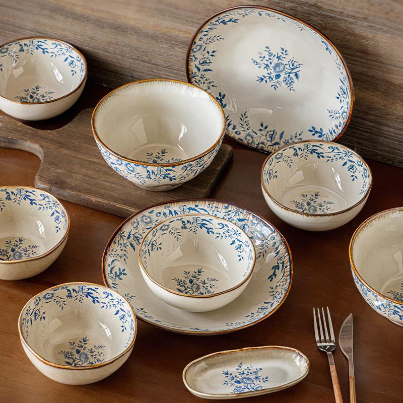 Blue Hibiscus Series Irregular Ceramic Bowls, Plates, Single Housewarming, High-Value Tableware Export