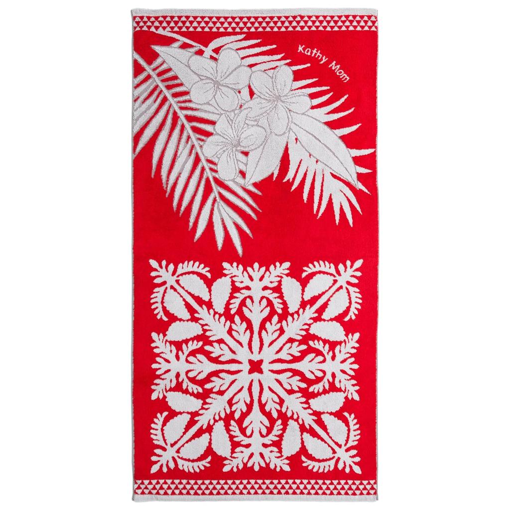 [Kathy Mam Island Style Bath Towel Hawaiian Quilt Pattern Meleohana Series] Produced by Hawaiian quilt artist Kathy Nakajima, this Hawaiian quilt pattern bath towel exudes a resort feel, featuring Hawaii's signature plant motif. Perfect for the bathroom, beach, or pool, it's also recommended as a decorative accent piece on a sofa or under your feet. It's perfect for the whole family, making it a perfect gift. [Size] Approximately 60cm wide x 120cm long [Color] Shower Tree Red