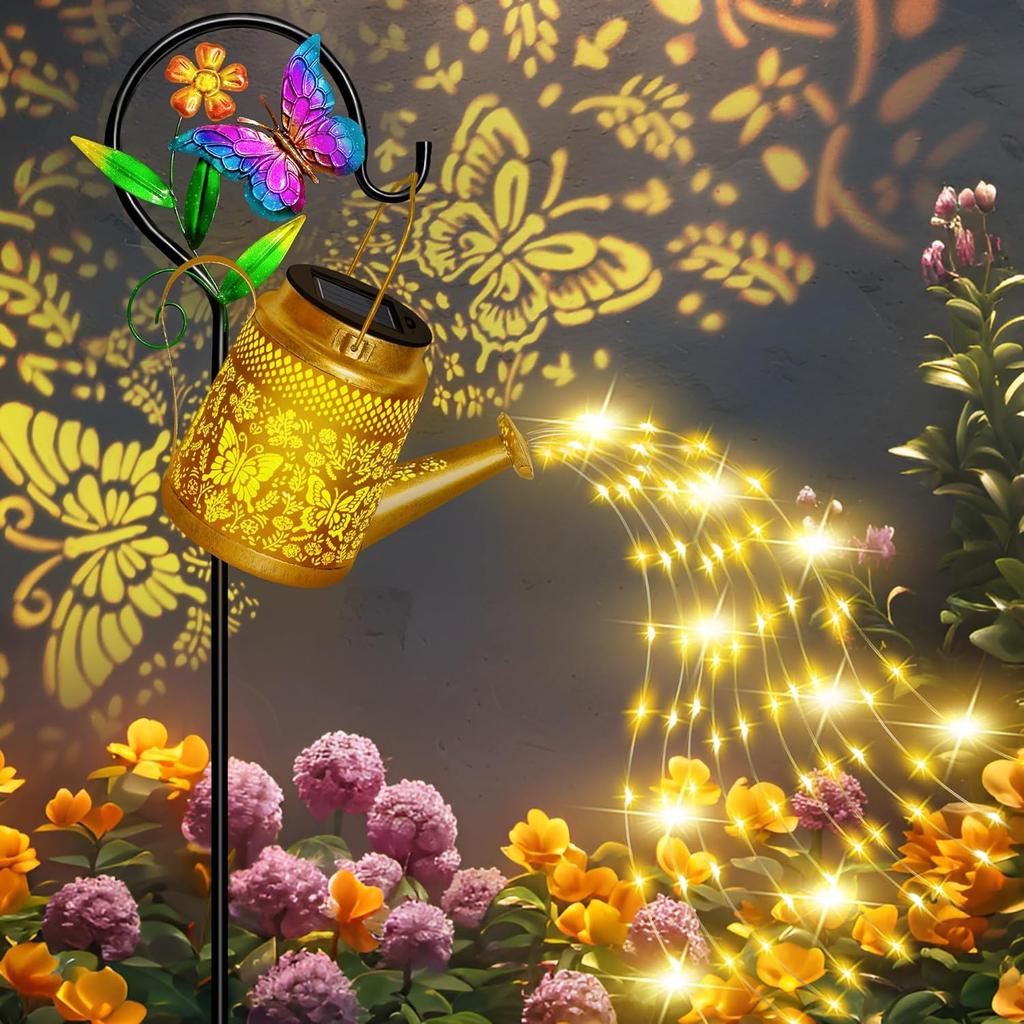 Solar Watering Can Lights Outdoor Garden Decor, Large Butterfly Hanging Lantern with Shepherd Hook, Waterproof Garden Lights for Outdoor Landscape
