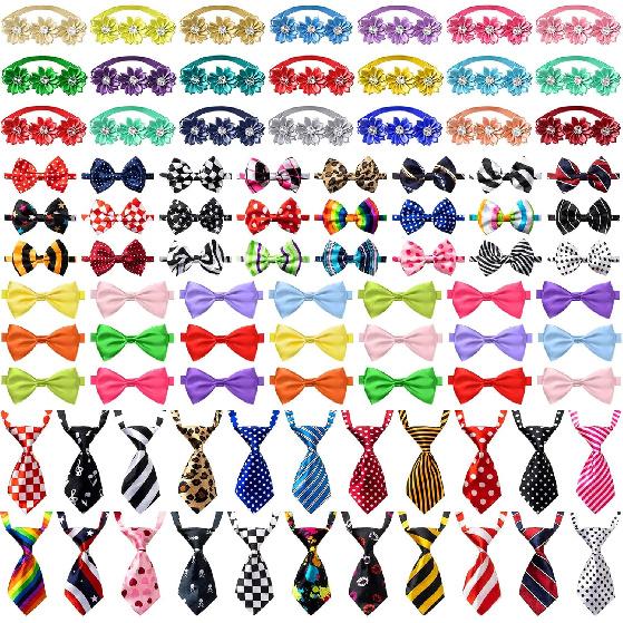Chumia 100 Pcs Adjustable Dog Ties Set Includes 50 Bow Ties 25 Neckties 25 Flower Neck Tie Assorted Bowtie Collar Grooming Accessories for Medium