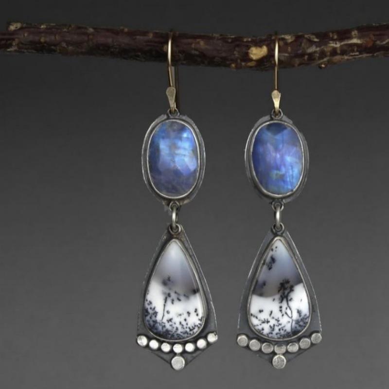 Vintage Waterdrop Round Inlaid Blue Stone Earrings Geometric Creativity Silver Color Dangle Earrings for Women Jewelry