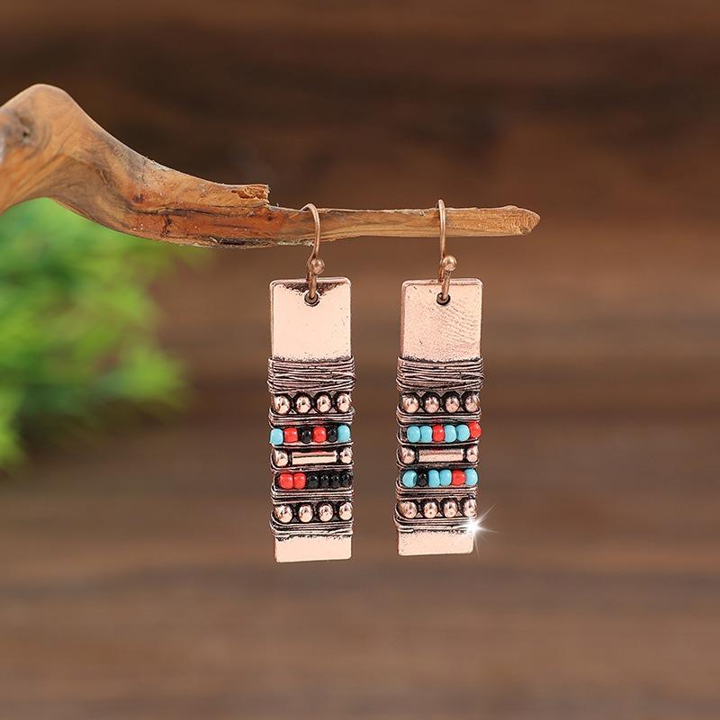 Etniczne Vintage Miedziany Kolor Metalowe Rzeźbione Kwadratowe Wielokolorowe Kamienne Kolczyki Wiszące dla Kobiet Biżuteria
