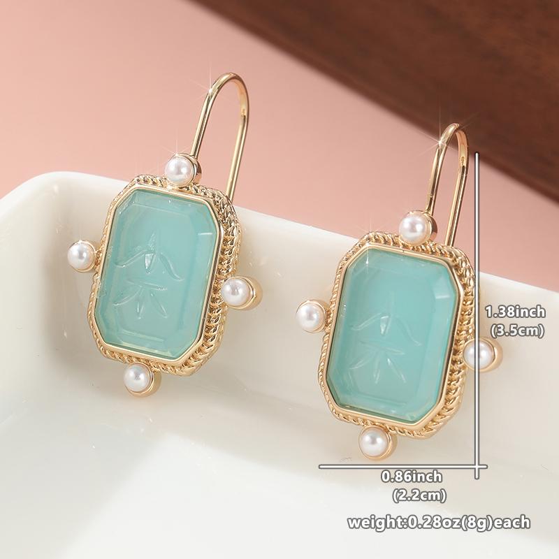 Vintage Gold Color Square Inlaid with Sea Blue Stones Earrings Imitation Pearl Dangle Earrings for Women Jewelry